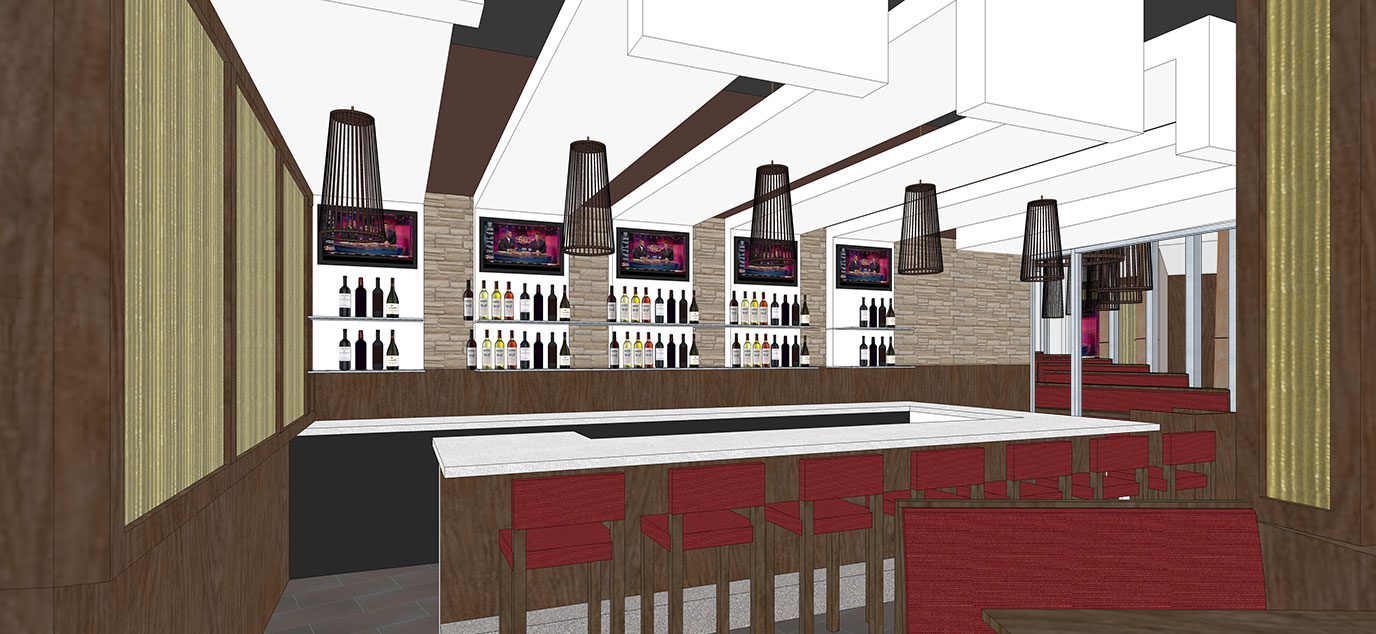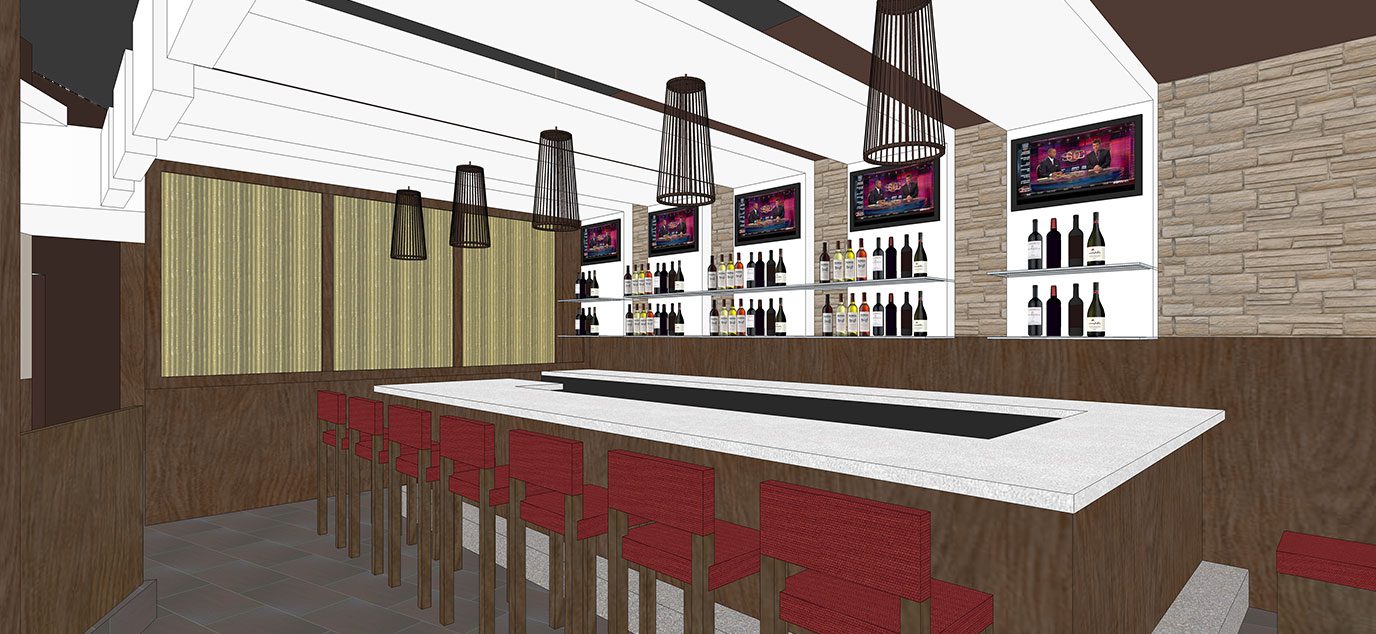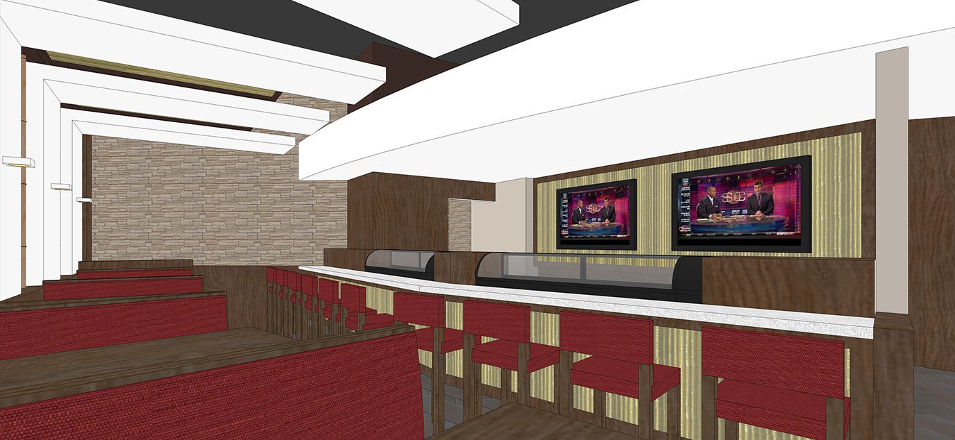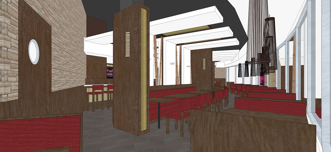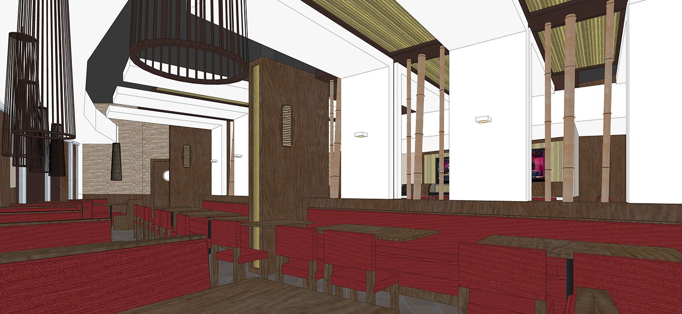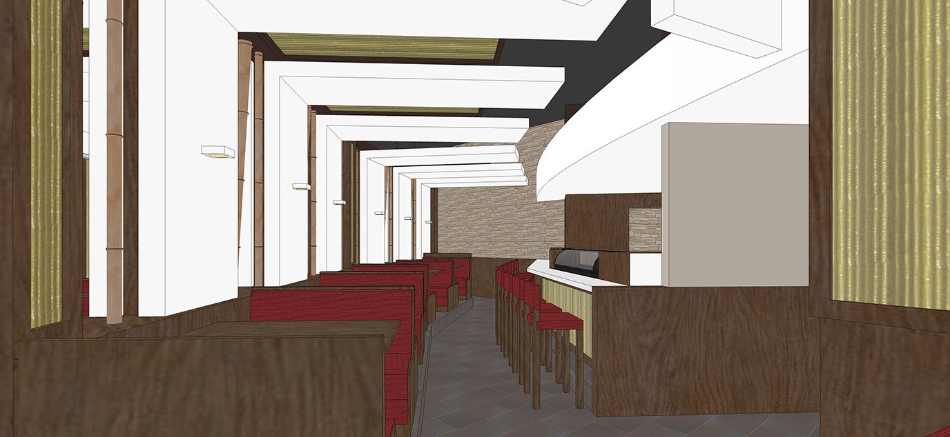 The white folded planes, dynamic lighting, and warm atmosphere establish a comfortable and contemporary setting for the sushi and Asian cuisine.